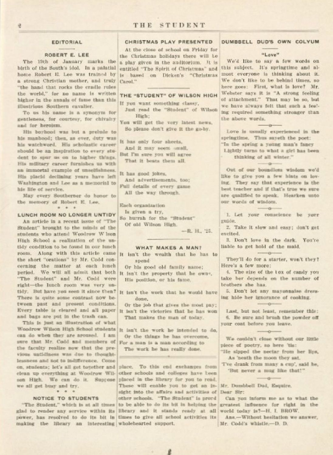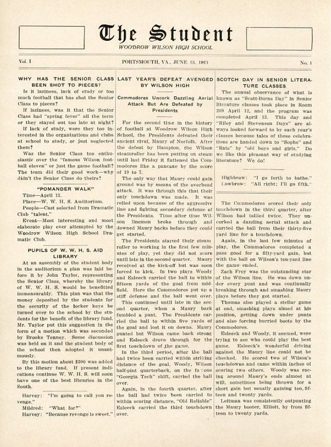 THE STUDENT, our high school publication, flourished until this year as a monthly magazine. Upon the Staff of 1923 fell the responsibility of converting it into a wide-wake weekly newspaper. They have published thirty-six issues that have been a credit to our school. The newspaper is connducted as a project of the English Department, under the supervision of a committee of English teachers. This committee consists of Miss Hilda Devilbliss, Miss Shannon Morton, and Miss Mary Beaton Gibbs. The following constitute the first newspaper staff of Woodrow Wilson High School: