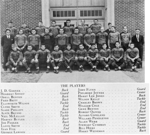Although the line was ranked among the finest, the backfield failed to supply a scoring punch and battled through six consecutive games without making a single tail)'. Relief came against the powerful Central team of Washington, D. C., when Lloyd Smith, end, took a pass in the end zone for a score. The traditional battle with Maury was played on a wet, murky day with every possible spectator looking on. For three bruising quarters, the under-dog Presidents held out against the Commodores’ powerhouse attack and even threatened once or twice themselves. Finally, in the last half, the State Champs smashed through Wilson’s heroic defenses and carried the day.