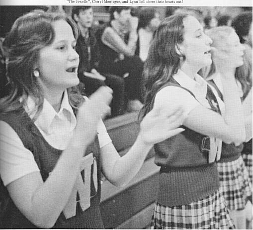 Bottom Row: Julie Lane, Diane Keyes (mascot), Vivian Howard, Alexis Savage (mascot), Susie Smith. Middle Row: Linda Lipford, Bonnie Simpson, Cathy Duke, Teresa Williams, Cheryl Montague, Lynn Bell, Faye Rooks. Top Row: Gale Ross, Linda Myers.
