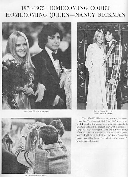The 1974-1975 Homecoming was truly an event to remember. The classes of 1948½ and 1949 were honored. Instead of the alumni presenting the assembly the S.C.A. entertained the student body with glimpses of the past. To get more spirit the students dressed in styles of the 40’s. The crowning of Nancy Rickman as queen was the highlight of the halftime and Karen Carswell was elected as maid-of-honor. Our defeating the Braves 12 to 6 was an added surprise.