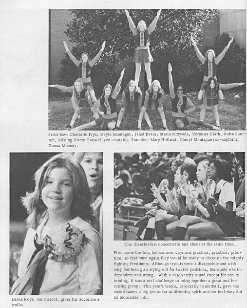 First came the long hot summer days and practice, practice, practice, so that once again they would be ready to cheer on the mighty fighting Presidents. Although tryouts were a disappointment with only fourteen girls trying out for twelve positions, the squad was in- dependent and strong. With a new varsity squad except for one returning, it was a real challenge to bring together a great and inspiring group. This year's teams, especially basketball, gave the cheerleaders a big job as far as directing spirit and we feel they did an incredible job