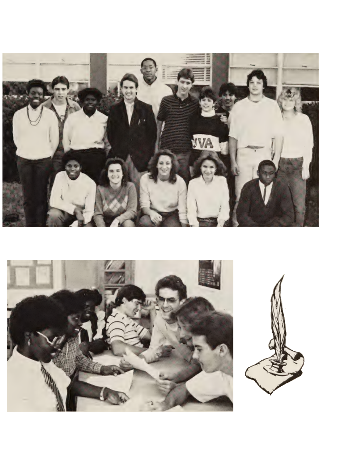 Journalism IJ students (L to R) V. Bazemore, R. Blount, C. Bratcher, T. Henderson, S. Jernigan, W. Outland, and D.L. Harrington calmly discuss preparation for the upcoming issue of THE STUDENT.
