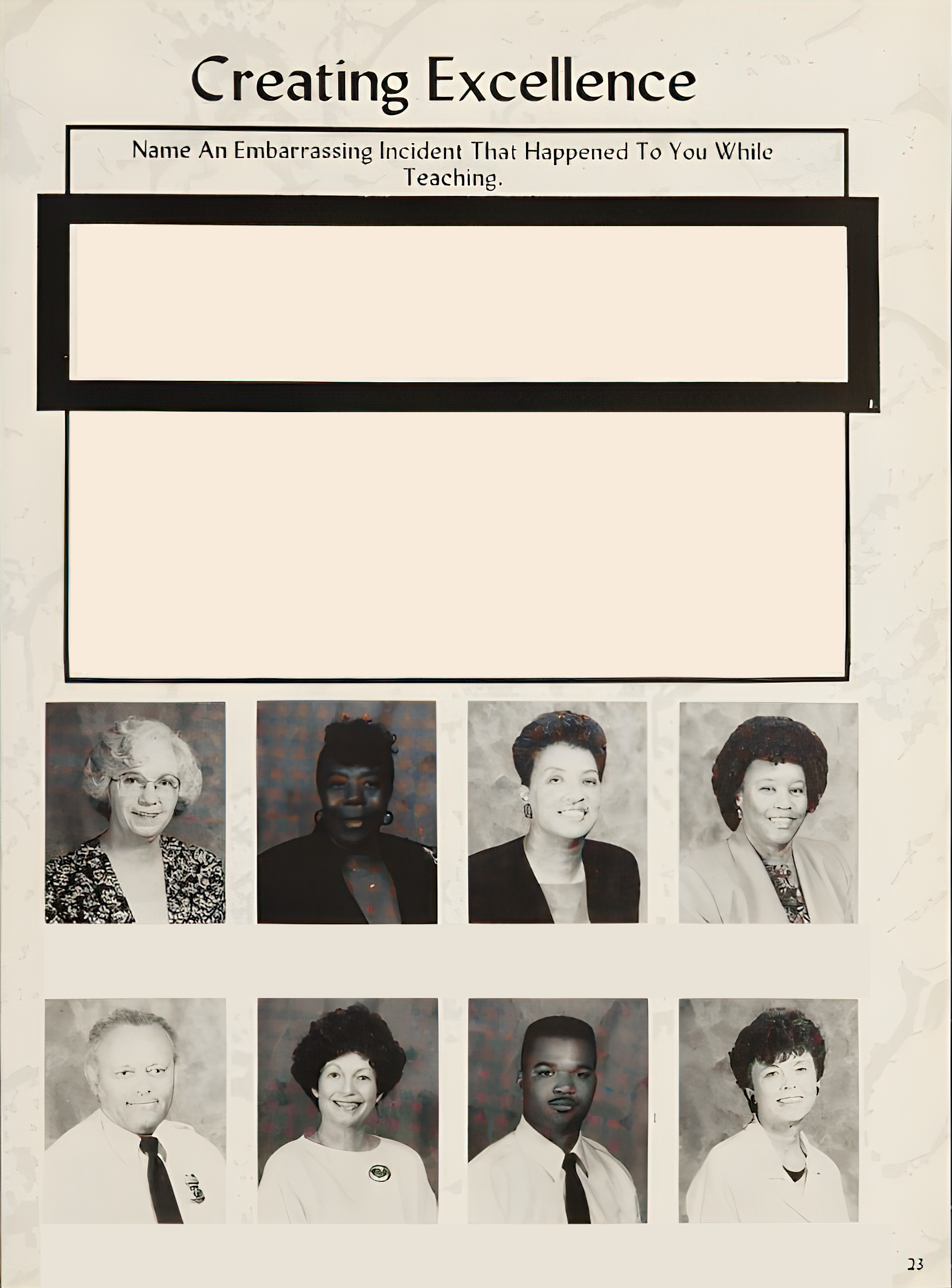 DONALD WILSON - "While opening a can of yellow paint, the top flew off and the paint splattered all over my glasses, face, and clothing while my students looked on. For the rest of the year I was referred to as "Big Yellow."