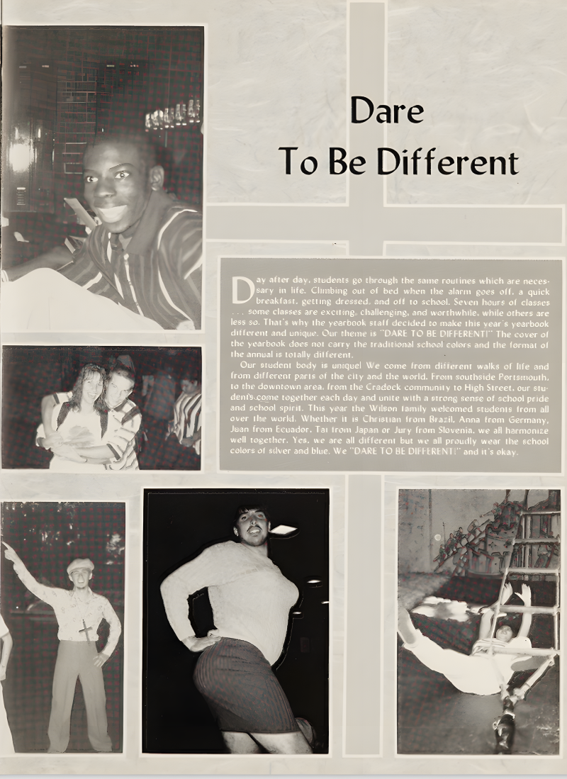 ... some classes are exciting, challenging, and worthwhile, while others are less so. That's why the yearbook staff decided to make this year's yearbook different and unique. Our theme is "DARE TO BE DIFFERENT!" The cover of the yearbook does not carry the tradtional school colors and the format of the yearbook is totally different.
